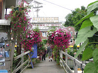 Around the corner and over about a block we found the flower bedecked bridge. Flowers cascaded from hanging pots and flower boxes from one side of the river to the other turned the span into a colorful rainbow garden.