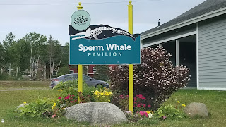 Whale Pavilion, a 40 foot Sperm Whale skeleton hangs from the ceiling. This looks like a fairly modern building. The whale on the outside door is eating a Giant Squid, its main diet.